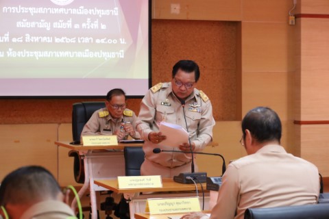 เทศบาลเมืองปทุมธานี จัดประชุมสภาเทศบาลเมืองปทุมธานี สมัยสามัญ สมัยที่ 3 ครั้งที่ 2 ประจำปี พ.ศ. 2568 ณ ห้องประชุมประชาสันนิบาต เทศบาลเมืองปทุมธานี เพื่อพิจารณาร่างเทศบัญญัติงบประมาณรายจ่ายประจำปีงบประมาณ พ.ศ. 2569 ในวาระที่ 2 และวาระที่ 3 และญัตติอื่นๆ เพื่อขอความเห็นชอบจากที่ประชุม