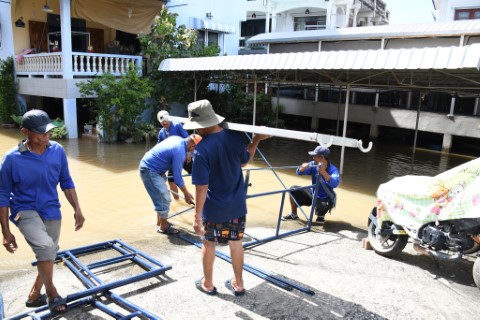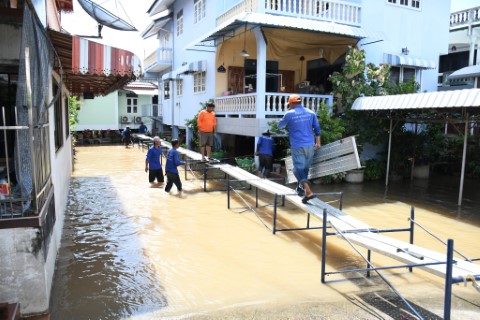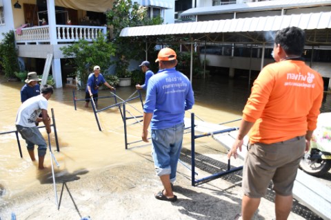 เจ้าหน้าที่งานป้องกันและบรรเทาสาธารณภัย และกองช่าง เทศบาลเมืองปทุมธานี ออกปฏิบัติงานป้องกันและแก้ไขปัญหาอุทกภัย ดังนี้ - นำกระสอบทรายอุดท่อระบายน้ำ บริเวณหน้าสำนักงานเหล่ากาชาดจังหวัดปทุมธานี และเสริมแนวกระสอบทรายบริเวณบ้านเรือนประชาชน ชุมชนวัดหงษ์ปทุมาวาส - สร้างสะพานทางเดินเข้าออกชั่วคราวบ้านเรือนประชาชน บริเวณชุมชนคลองพิกุล เพื่อบรรเทาความเดือดร้อนให้ประชาชน เนื่องจากระดับน้ำในแม่น้ำเจ้าพระยายังคงเพิ่มสูงขึ้นอย่างรวดเร็วและกระแสน้ำไหลแรงจากการระบายน้ำ ทำให้เกิดน้ำท่วมขังและน้ำล้นตลิ่งในพื้นที่ เจ้าหน้าที่จึงเร่งการป้องกันบรรเทาความเดือดร้อนให้ประชาชน