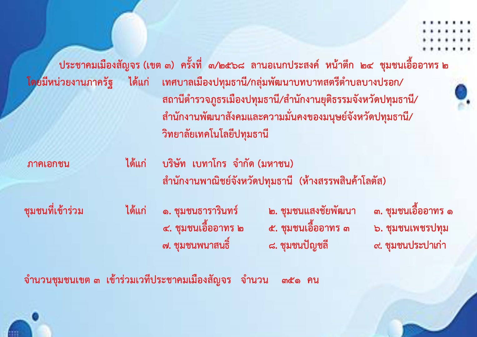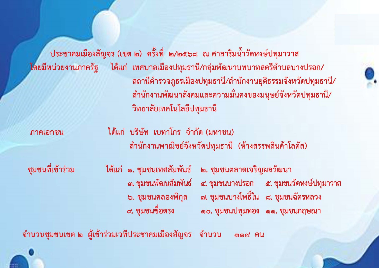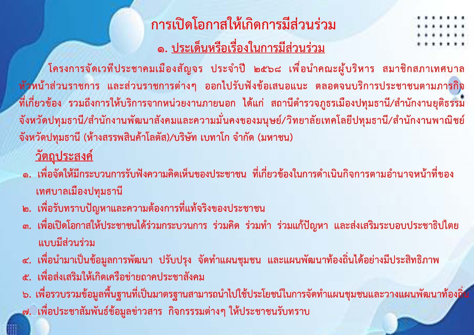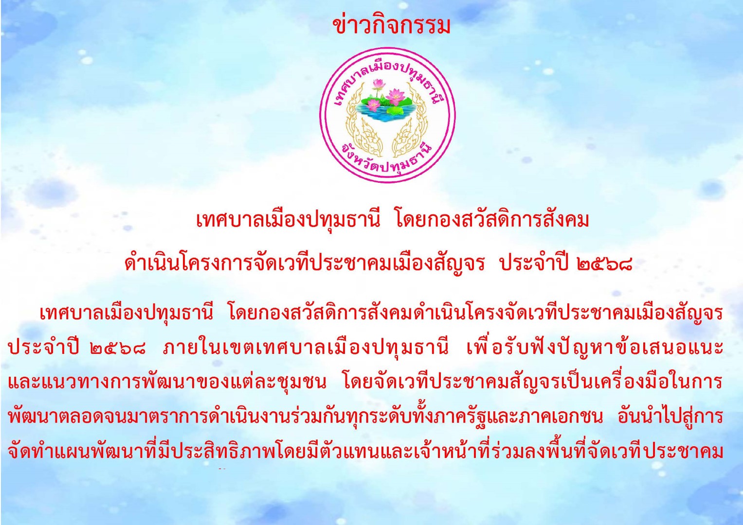 เทศบาลเมืองปทุมธานี โดยกองสวัสดิการสังคมดำเนินการจัดเวทีประชาคม เมืองสัญจร ประจำปี 2568 ภายในเขตเทศบาลเมืองปทุมธานี เพื่อรับฟังปัญหา ข้อเสนอแนะ และแนวทางการพัฒนาของแต่ละชุมชน โดยจัดเวทีประชาคมสัญจร เป็นเครื่องมือในการพัฒนา ตลอดจนมาตราการดําเนินงานร่วมกันทุกระดับทั้งภาครัฐ และภาคเอกชน อันนําไปสู่การจัดทำแผนพัฒนาที่มีประสิทธิภาพโดยมีตัวแทนและเจ้าหน้าที่ร่วมลงพื้นที่จัดเวทีประชาคมเมืองสัญจร จำนวน 3 ครั้ง
