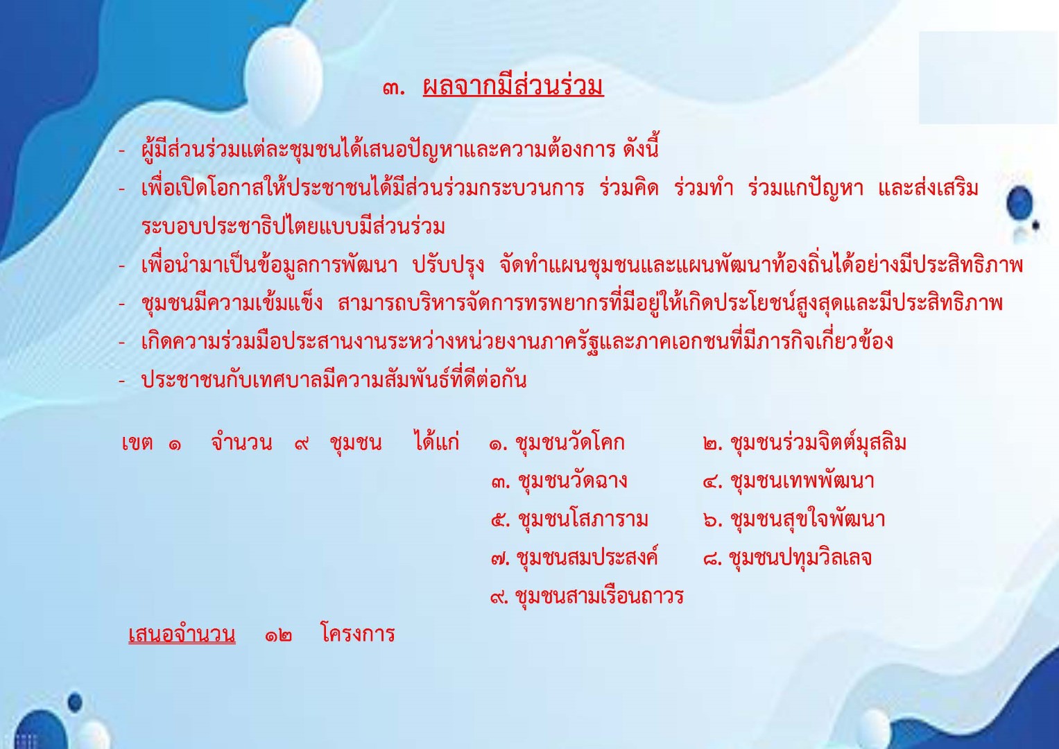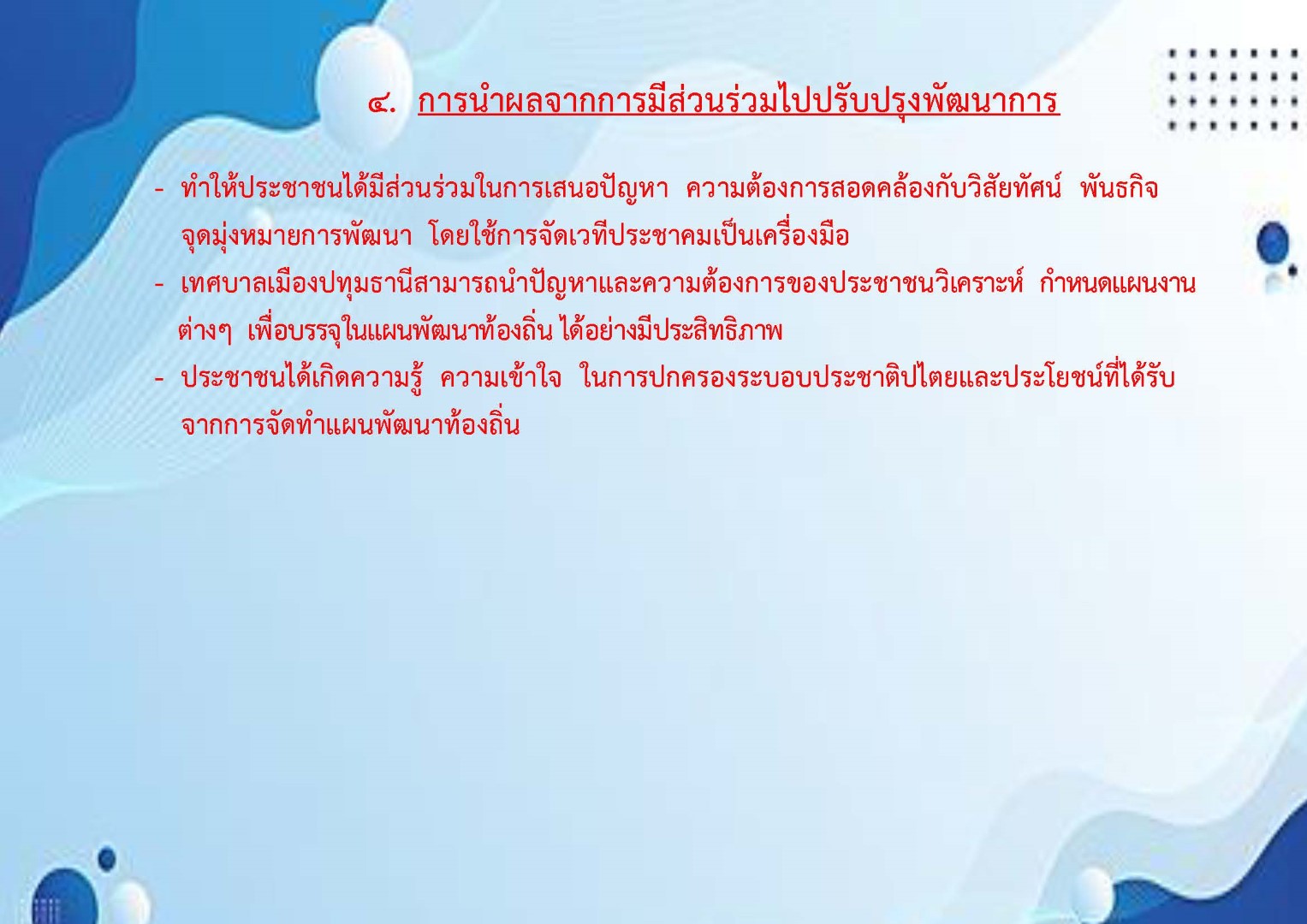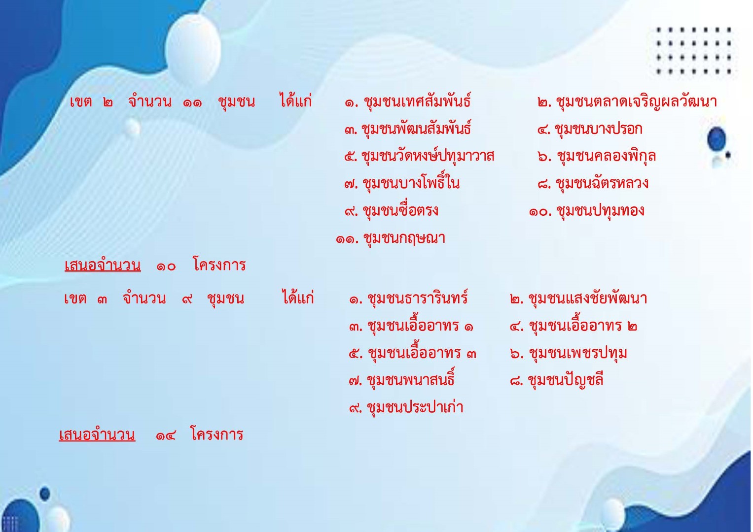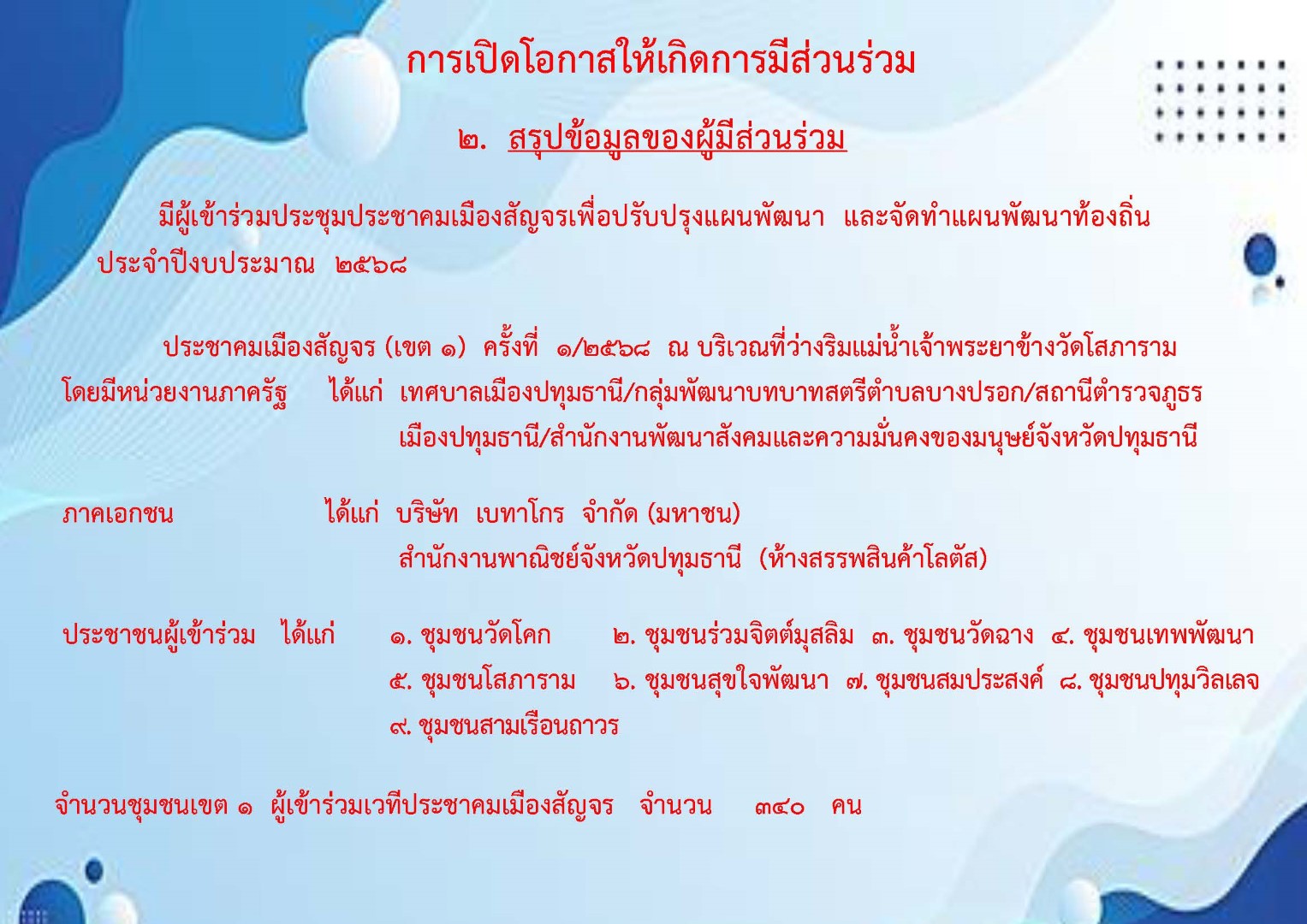 เทศบาลเมืองปทุมธานี โดยกองสวัสดิการสังคมดำเนินการจัดเวทีประชาคม เมืองสัญจร ประจำปี 2568 ภายในเขตเทศบาลเมืองปทุมธานี เพื่อรับฟังปัญหา ข้อเสนอแนะ และแนวทางการพัฒนาของแต่ละชุมชน โดยจัดเวทีประชาคมสัญจร เป็นเครื่องมือในการพัฒนา ตลอดจนมาตราการดําเนินงานร่วมกันทุกระดับทั้งภาครัฐ และภาคเอกชน อันนําไปสู่การจัดทำแผนพัฒนาที่มีประสิทธิภาพโดยมีตัวแทนและเจ้าหน้าที่ร่วมลงพื้นที่จัดเวทีประชาคมเมืองสัญจร จำนวน 3 ครั้ง