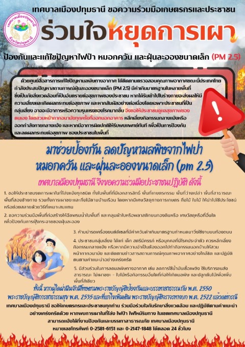 เทศบาลเมืองปทุมธานี ขอความร่วมมือเกษตรกรและประชาชน ร่วมใจ หยุดการเผา ป้องกันและแก้ไขปัญหาไฟป่า หมอกควัน และฝุ่นละอองขนาดเล็ก (PM 2.5)